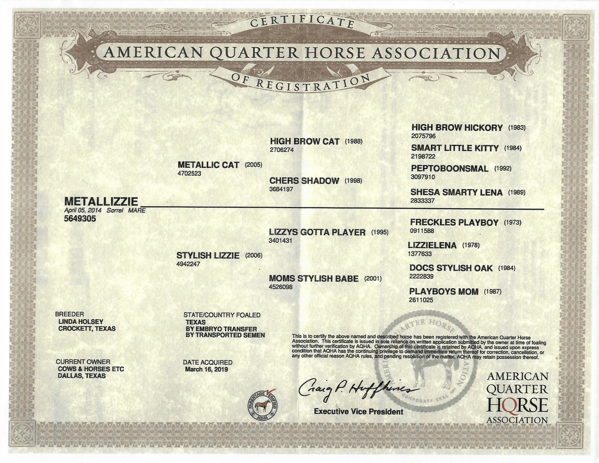 Metallizzie, affectionately known as Tizzy, is not just renowned for her world championship title, but also for her illustrious pedigree and her progeny’s potential. As the 2021 NCHA World Champion $25,000 Novice Horse, ridden by NCHA Hall of Fame trainer Tim Smith, Tizzy boasts over $126,000 in earnings. Her sire, Metallic Cat, is the second highest money-earning stallion in the history of the NCHA. He was the 2008 NCHA Futurity Champion, 2008 NCHA Horse of the Year, Super Stakes Reserve Champion, and BI Derby Champion, with offspring earnings surpassing $49 million. Her dam, Stylish Lizzie, has also made her mark in the cutting horse world with substantial earnings and she is a producer of multiple money-earners. Tizzy’s lineage is not only impressive, but also promises continued success through her foals. Her oldest, a two-year-old gelding by Don’t Stopp Believin, was sold as a yearling and is now in training with Justin Wright.