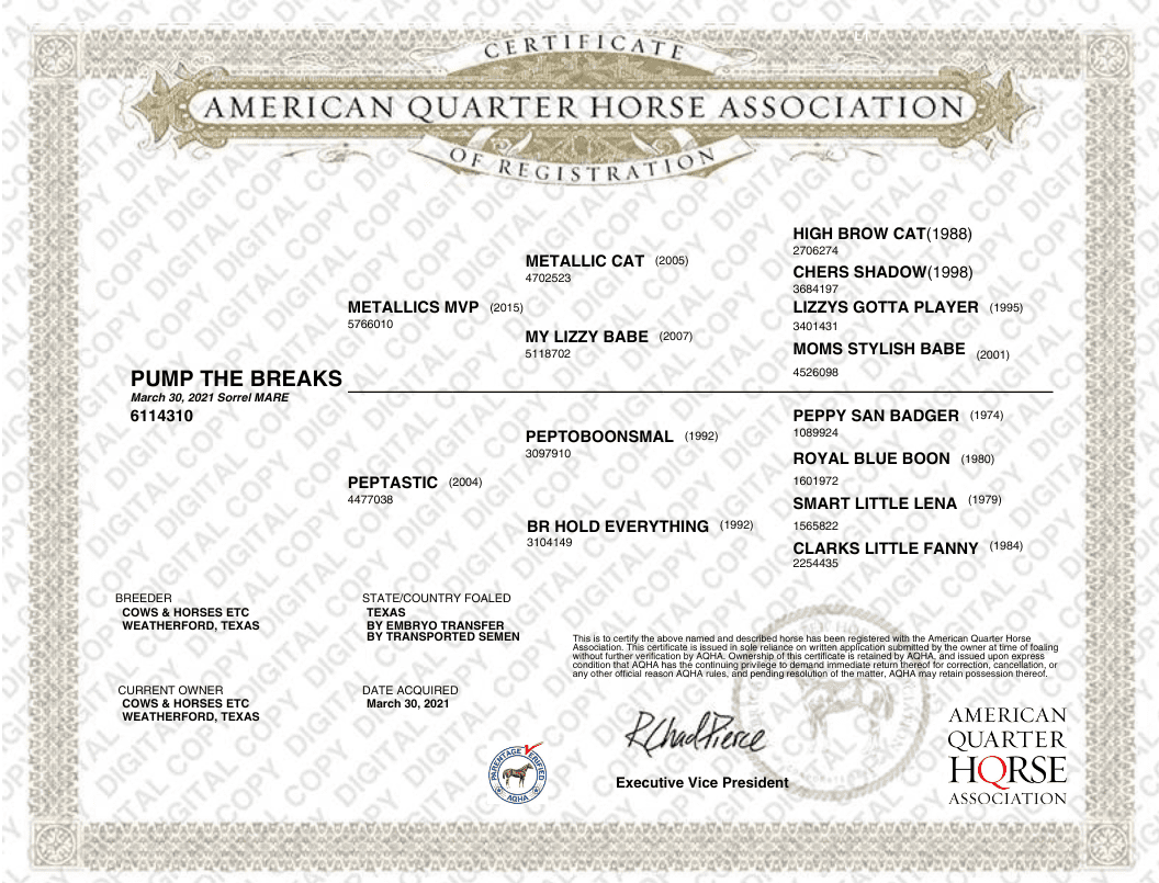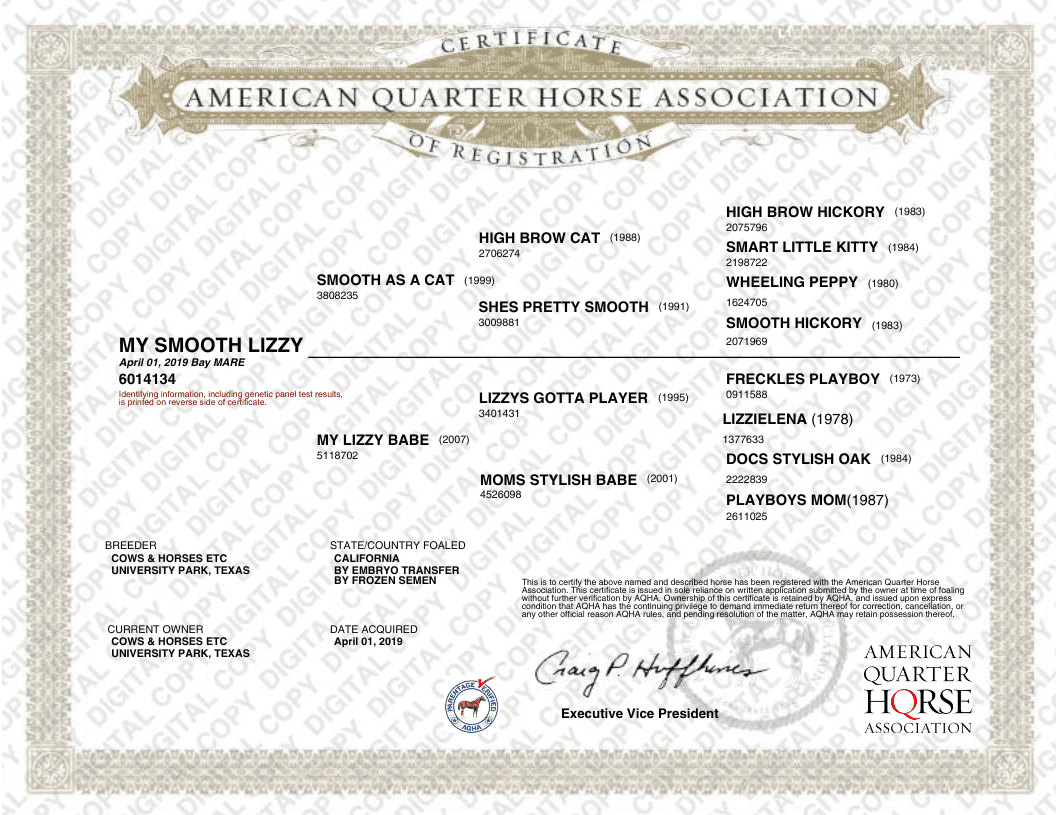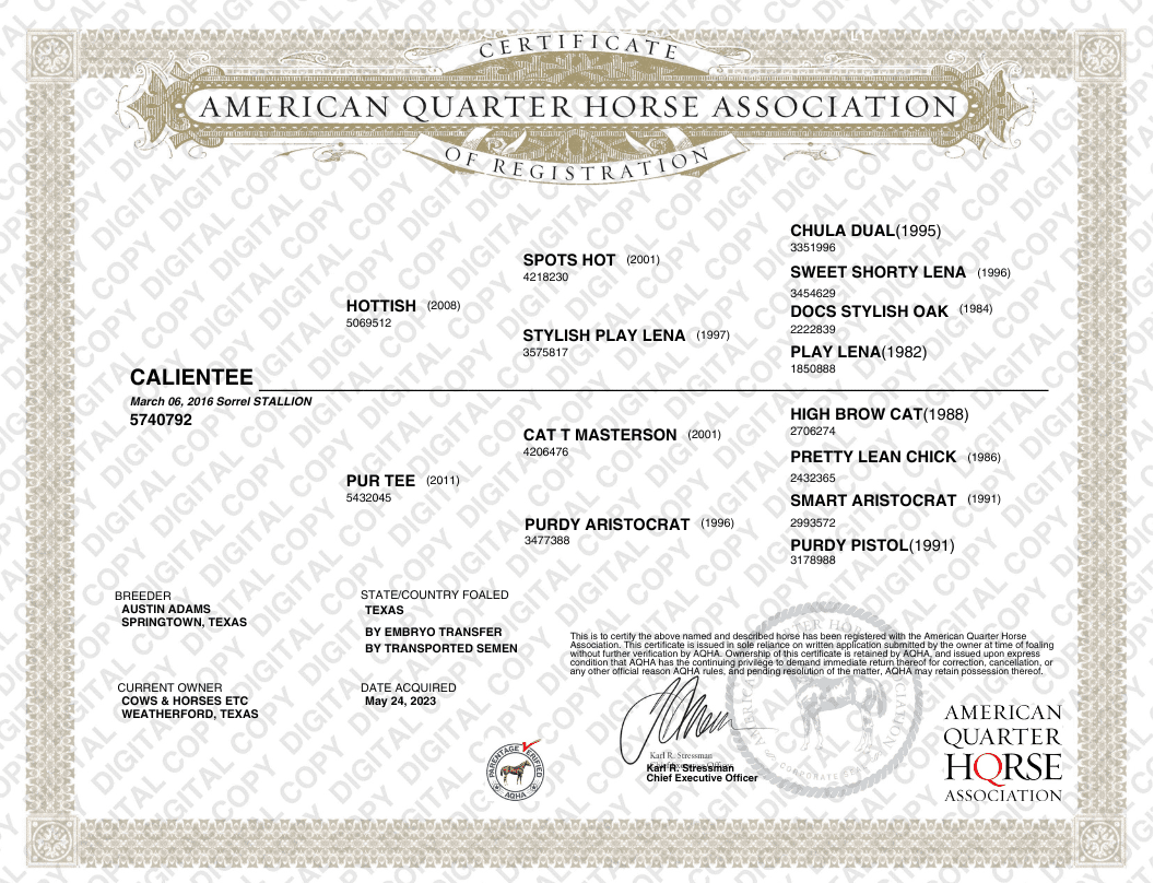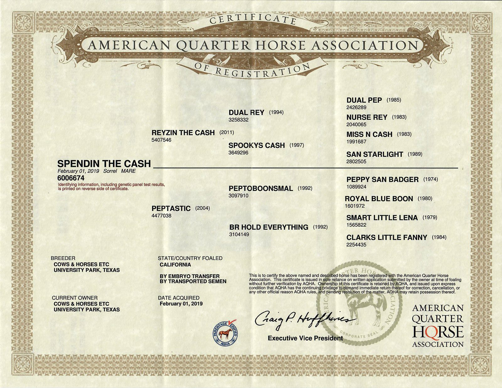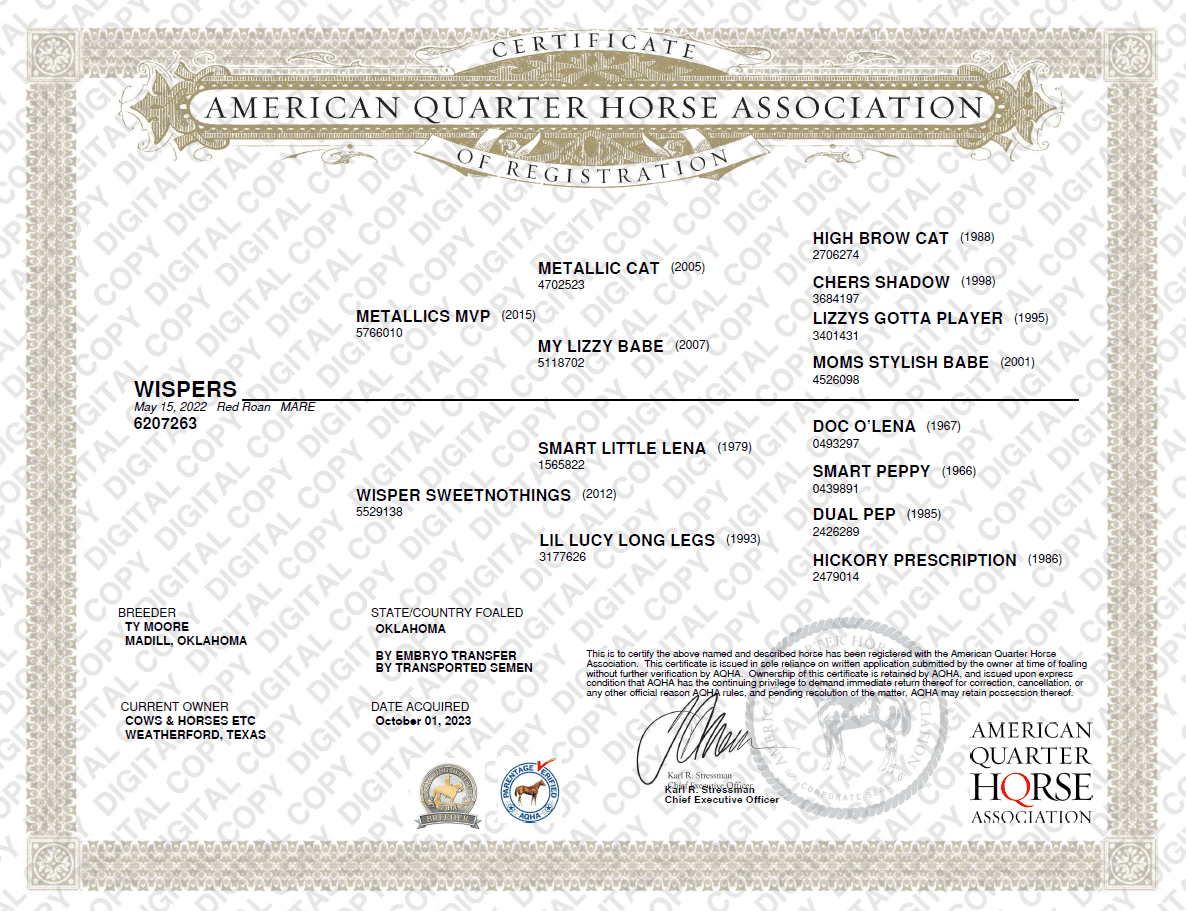 Secrets competitive triumphs include being a PCCHA Cutting Stakes Open Champion and a consistent finalist in major events such as the NCHA Super Stakes and PCCHA Classic/Challenge. Showcased by renowned NCHA Hall of Fame trainers Tim Smith and Phil Hanson, Frecklesareinstyle has proven her worth both in the show pen and as a valuable producer of champions.
