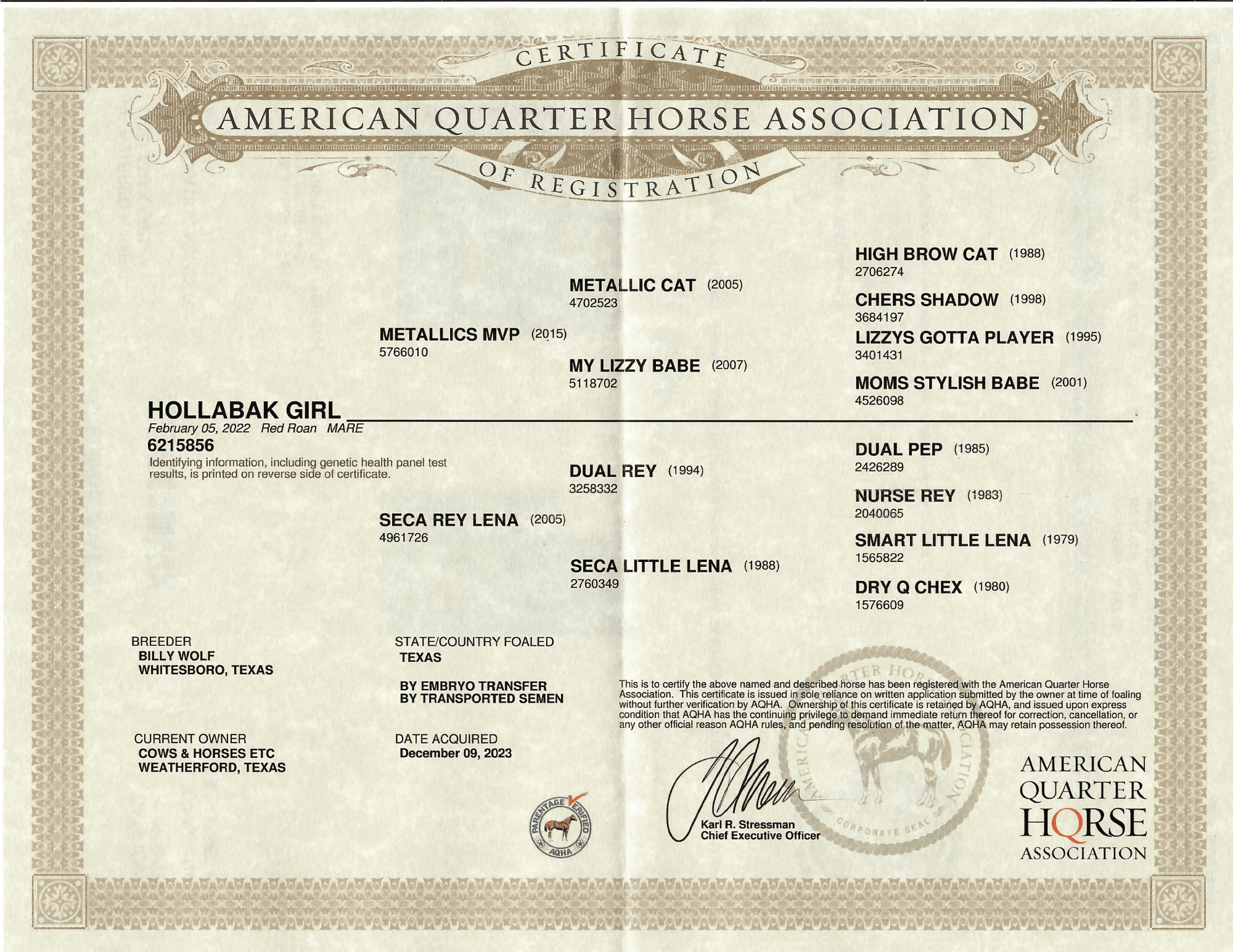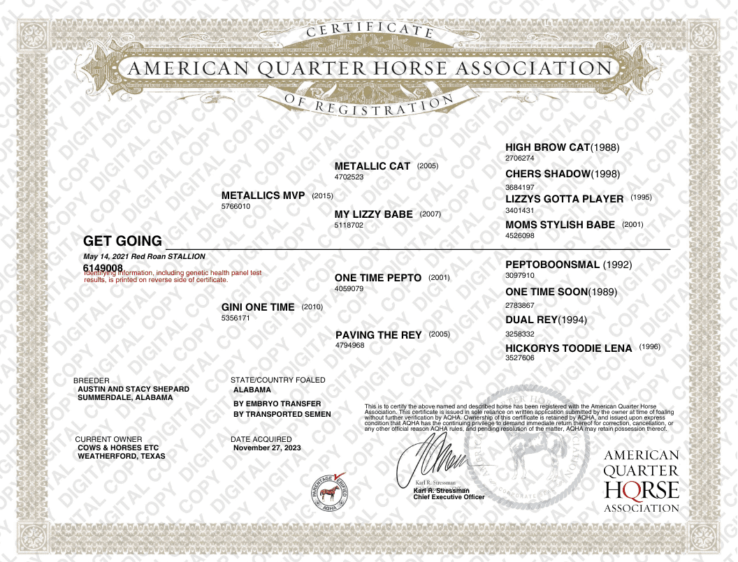 Metallics MVP is a standout cutting horse stallion whose prowess in the arena is beyond compare. Metallics MVP (NCHA $328,930.90) was crowned the 2022 National Cutting Horse Association Open World Champion. His 2022 campaign was a tour de force, amassing $107,992 in earnings and securing 100 checks across 150 shows, a testament to his consistent excellence and competitive spirit. Victories early in Metallics MVP’s career, piloted by NCHA Hall of Fame trainer Beau Galyean, include the 2021 Brazos Bash Open Classic, and the 2021 Cotton Stakes Open Classic, further underscoring his dominance in the sport. Beyond his athletic achievements, Metallics MVP’s journey from being the offspring of John’s popular champion mare, My Lizzy Babe, to becoming a highly acclaimed champion himself has captured the hearts of the cutting horse community, earning him the affectionate moniker “the people’s horse” and solidifying his legacy in the sport. Metallics MVP’s first offspring are two-year-olds this year and are highly anticipated to highlight this champion’s production potential. Watch for his super athletic, cowy, and intelligent offspring at the NCHA sales this Fall.