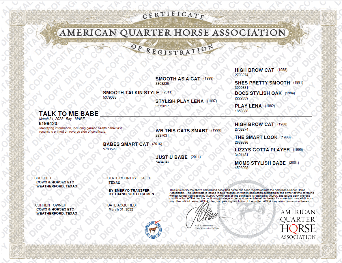 * Photo is of Babes Smart Cat’s 2022 Smooth Talkin Style filly, Talk To Me Babe